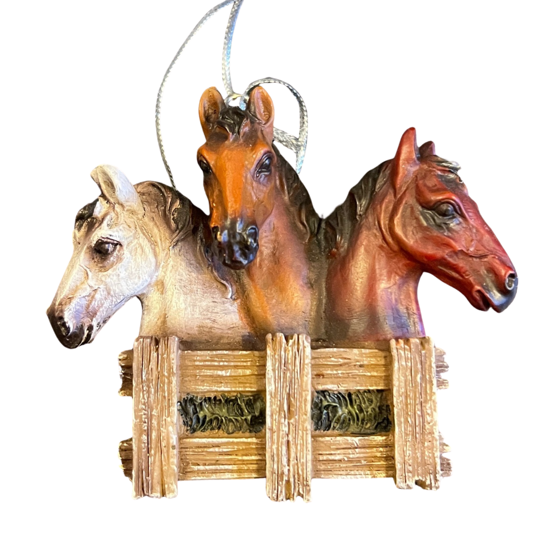 Get greeted by 3 lovely horses waiting at the fence when you hang this ornament from your tree!