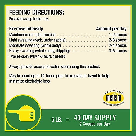Electrolyte supplementation is often thought of as only needed by performance horses; however, any horse that sweats for a prolonged period of time, regardless of reason, will benefit from electrolyte supplementation. Horses sweat for various reasons, the most common being exercise, weather, stress, and illness. When horses sweat, it results in the loss of not only water, but also sodium chloride, potassium and lesser amounts of calcium and magnesium. If these are not replenished, it could result in a significant body deficit of these electrolytes and cause fatigue, muscle weakness, fatigue, reduced feed and water intake, and reduced sweating, which can lead to overheating and compromise overall health and performance. Apple Elite Electrolyte supplement replaces vital minerals lost through sweat during exercise, extreme weather conditions and stressful situations. This complete electrolyte formula is an excellent means to encourage healthy water consumption year-round, and support muscle function, fluid balance and energy production at a cellular level. This palatable apple-flavored powder is great for daily use; just mix in with your horse's regular grain ration.