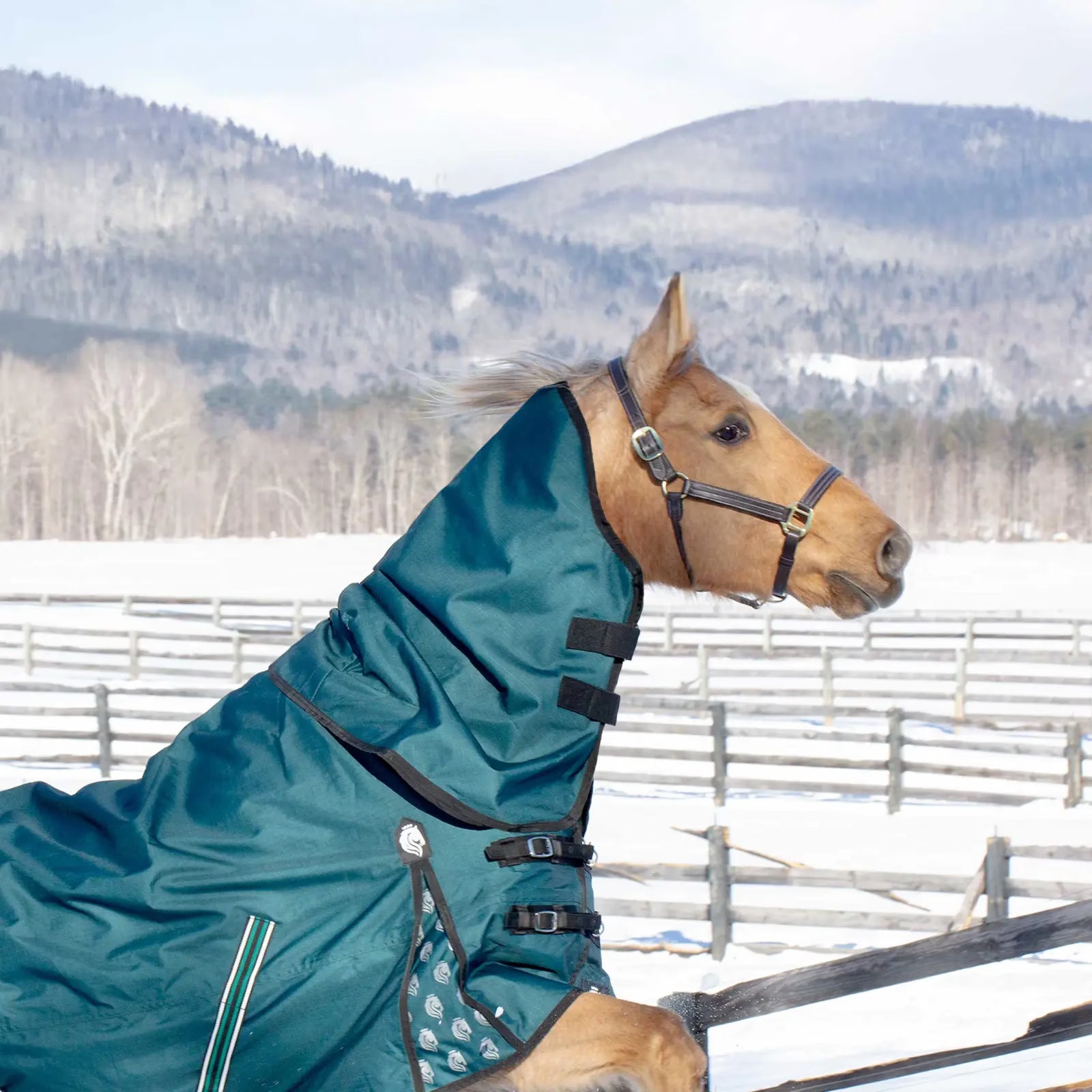 Our unique neck cover attachment system uses only hook and loop strips covered in surcingle webbing. The neck cover attaches to the Arktis Turnout on each side of the shoulder. It provides gap-free coverage, even while grazing. Since it has no metal components for attachment to the Arktis Turnout, it’s more comfortable for the horse. There are no metal pieces or snaps to pinch and poke her, especially while laying down.