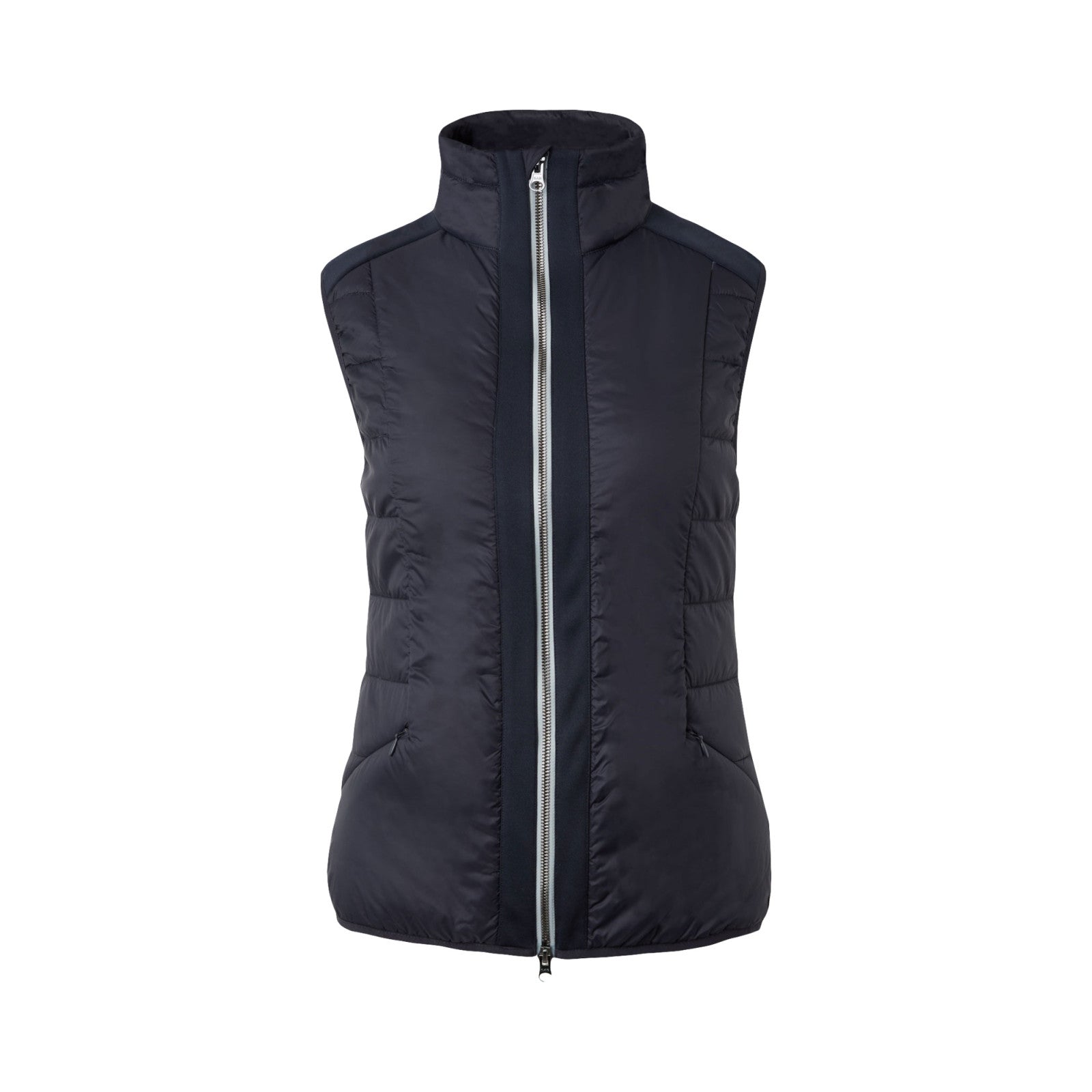 This functional women's vest has light padding and is quilted at the sides and has a one side stretch fleece panel at the back middle and also at back of sleeves, to provide optimal moveability when riding. Contrasting piping at hem, armholes and zipper. Water repellent and windproof, this is a perfect option for layering. 3D logo print on the back below the neck and a small metal logo plate at the front hem. Two hidden zipper pockets for keeping your belongings safe during rides.