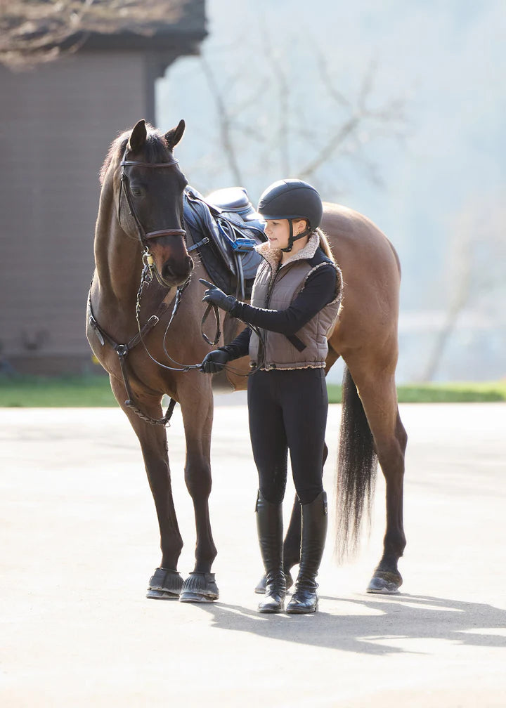 Kick up your riding wardrobe with this reversible, cropped vest—offering two stylish looks in one. One side features classic smooth canvas; the other, cozy sherpa fleece, quilted together with 140g poly-loft fill for core warmth. A tall collar, adjustable drawcord waist, and dual-sided pockets blend comfort and function with modern equestrian flair.