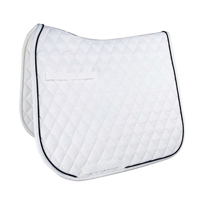 The resilient poly/cotton quilted top is embellished with piping, and a 100% brushed cotton lining offers a comfortable, nonslip surface against the horse. Contoured at the withers for a better fit, this dressage pad maintains a comfortable contact with the horse and does not bunch up under the saddle.