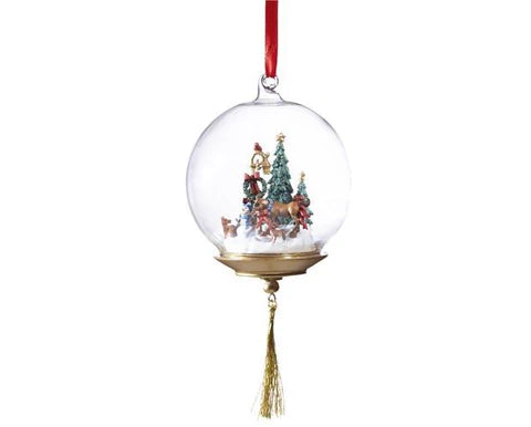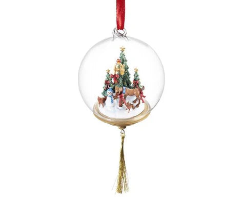 This charming blown glass globe ornament portrays a touching scene of a foal, fawn, and fox cub celebrating their first holiday season by decorating a snowman together. Captured in hand-painted artist's resin, this ornament hangs from a satin ribbon, with a gold tassel hanging from the underside. 3" diameter.