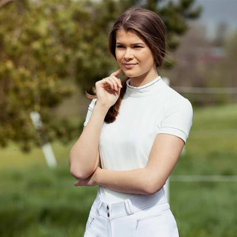 This gorgeous show shirt features short sleeves, a back opening and beautifully soft, smooth fabric - the perfect combination for a great competing shirt. A row of glittering crystals embellish the collar and add a touch of bling to this new show shirt. The fabric is breathable and super comfortable, allowing you to hold concentration while you ride and giving you supreme flexibility in the saddle.
