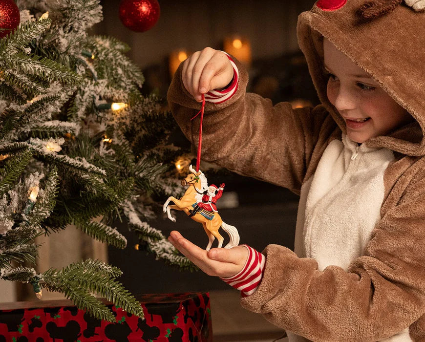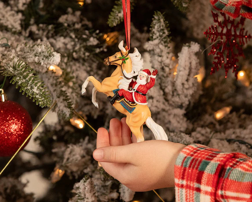 Santa is embracing his inner cowboy this year, ready to head out for Christmas deliveries on a flashy golden palomino! Before he departs, his mount rears dramatically as Santa waves to all who came to see him off on his journey.