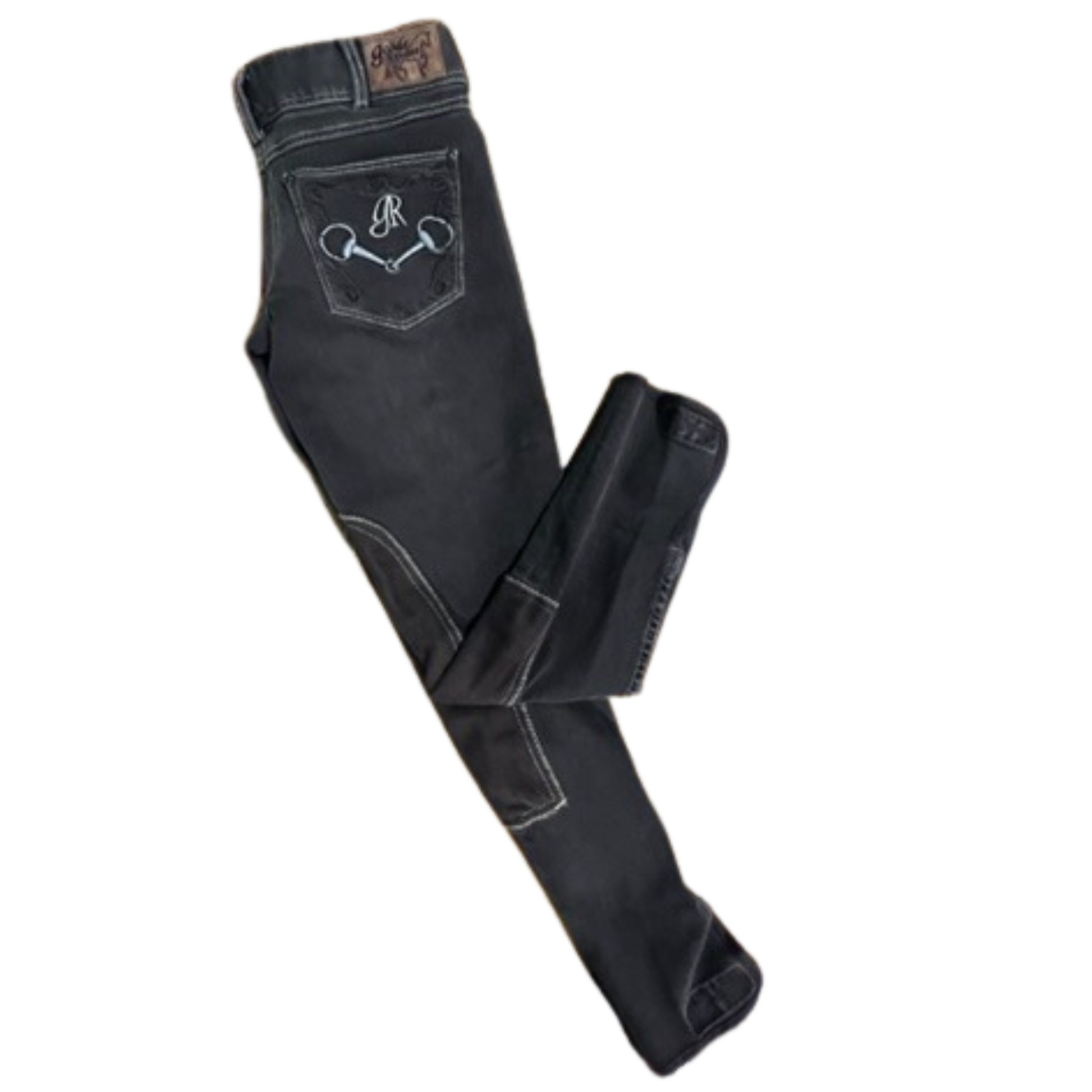 These chocolate colored denim breeches have real back pockets with beautiful embroidered bit design. The low rise, elastic, contour fit waistband makes the fit feel nearly custom for ultimate comfort. The faux suede knee patch provides ultimate non-slip performance in the saddle.