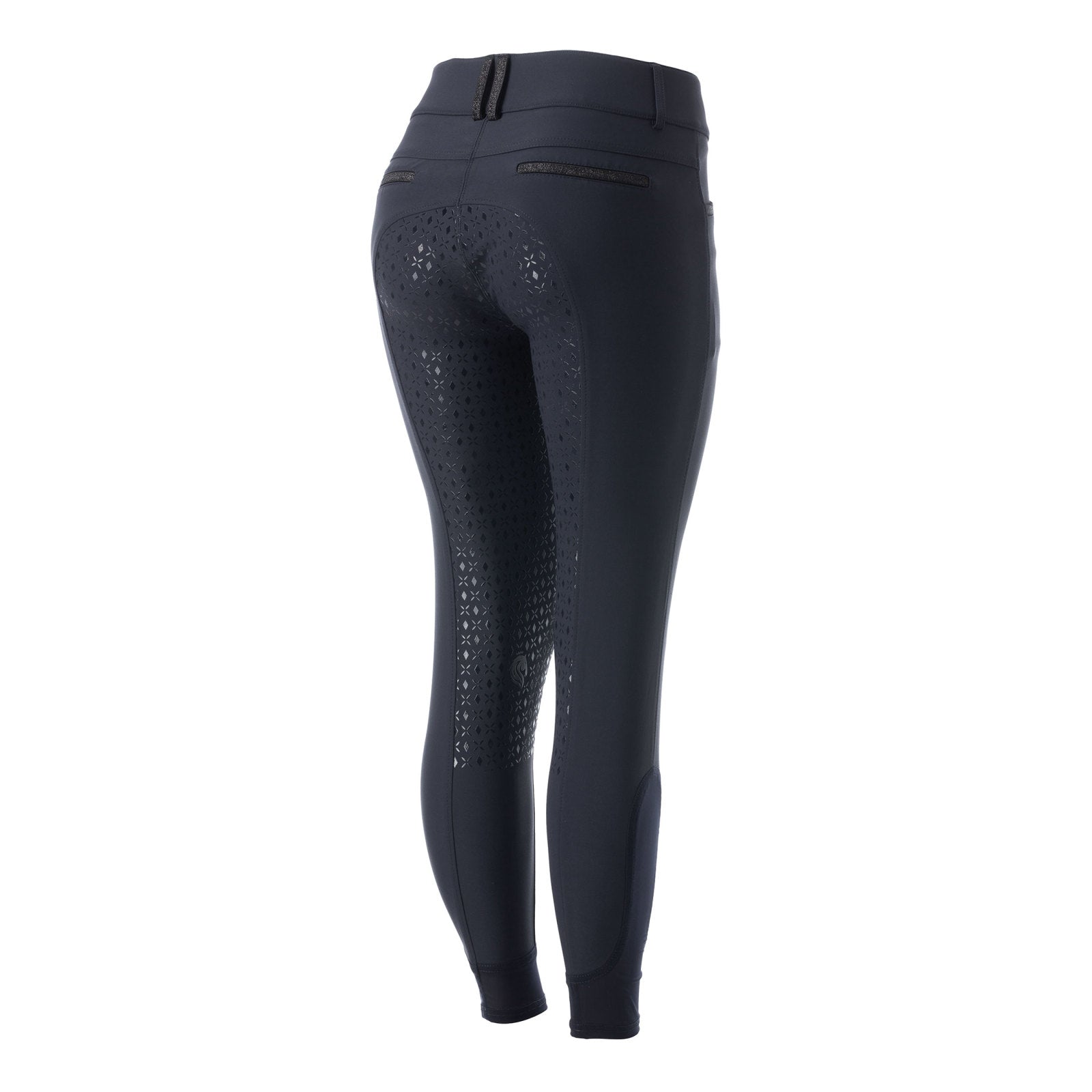 The Equinavia Kristina Women's Full Seat Breeches are a stylish addition to the popular Meryl breech collection. Crafted from durable mid-weight technical Meryl fabric, these breeches offer excellent stretch and recovery. Designed with a mid-rise cut, they provide extra comfort in the saddle, featuring a slightly higher back. The front zip with two Gutos slide closures ensures a secure fit, while lightweight micro-mesh sock bottoms offer breathability. Shimmery tape trim on the front slash pockets, faux back pockets, and back belt loops adds a touch of flair to this functional design.