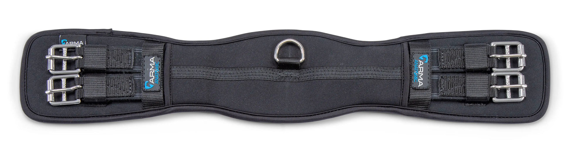 Friction free and cushioning, the ARMA neoprene dressage girth protects against rubbing and galls. Moisture resistant fabric stays soft and flexible, gliding over the skin without friction to avoid chafing. Anatomic contour shaping provides unrestricted movement around the elbows and better pressure distribution. Flexible backing, reinforced with non-stretch nylon webbing. Pressure alleviating elastic inserts at both ends. Stainless steel roller buckles and fittings for long lasting performance. Centre D-ring for attaching a martingale or breastplate.