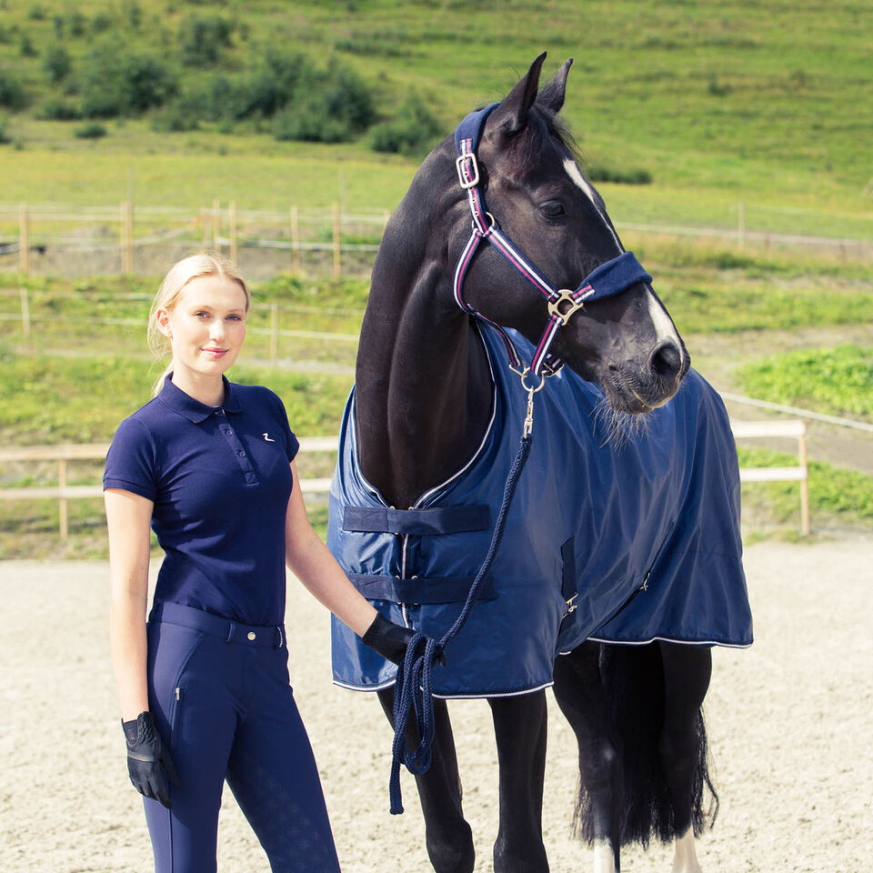 Arrive at your next event with this functional, yet elegant dress sheet with a soft cotton lining and clear, crisp lines. Simple piped edges in an elegant design add style and class to this lightweight summer dress sheet. The smooth surface keeps dust away and looks great waiting ringside or during transport. Cross surcingle and silver-colored satin finish buckles with a Velcro reinforced front closure keep this blanket in place.