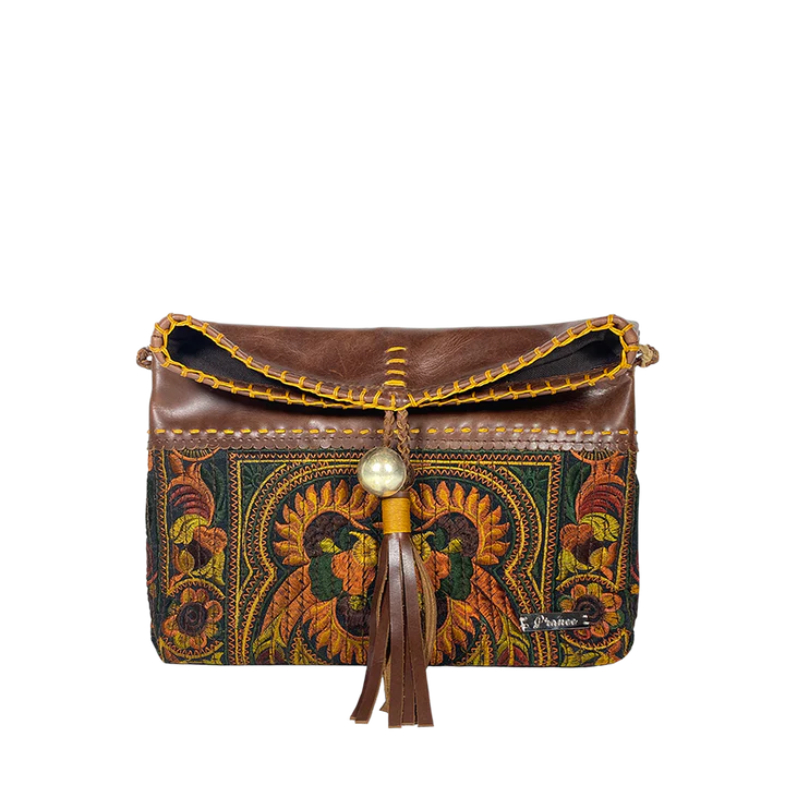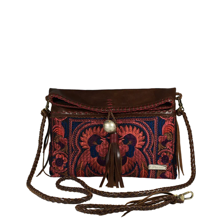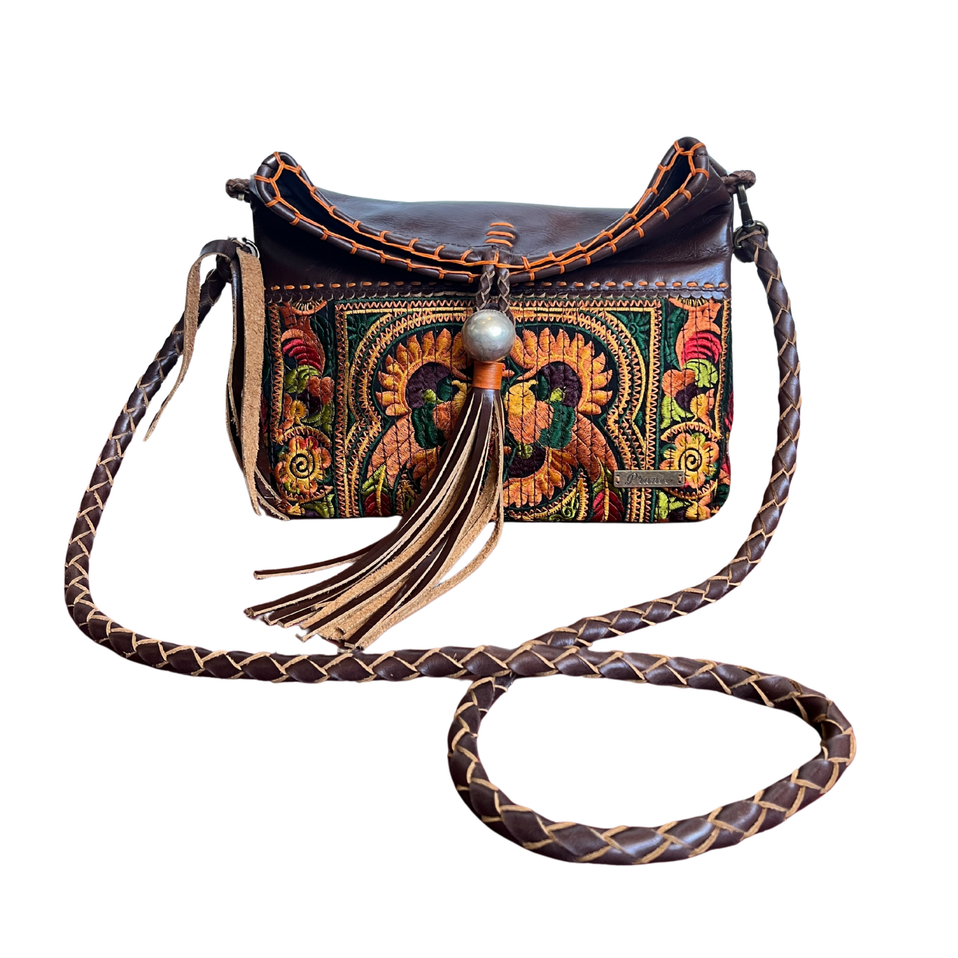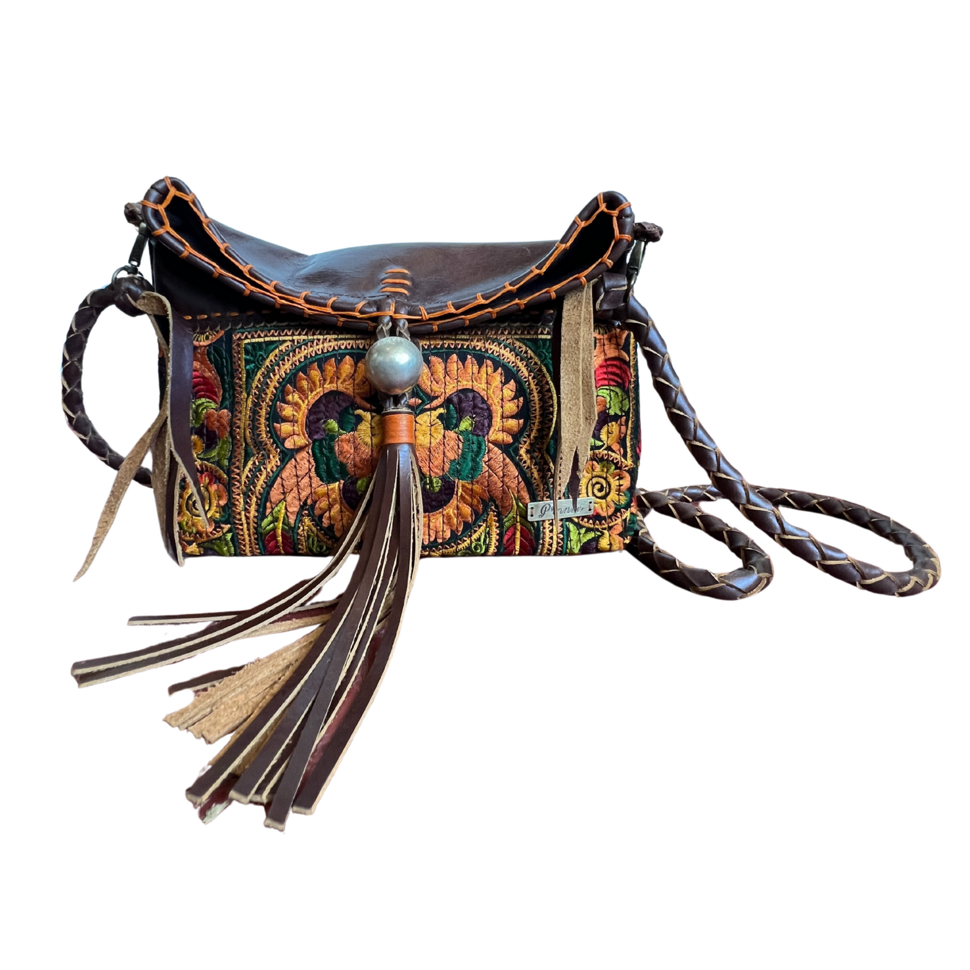 Raven, from the Phoenix Collection, is fun and flirty shoulder bag. With the removable leather strap, you can wear it as a shoulder bag or carry it like a wristlet. Small and practical! Leather and our hand-sewn embroidery are crafted together with decorative stitching and amazing fringe! Interior pockets help keep your phone and keys easily accessible.
