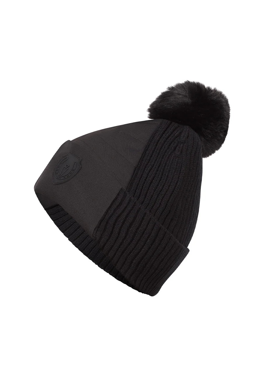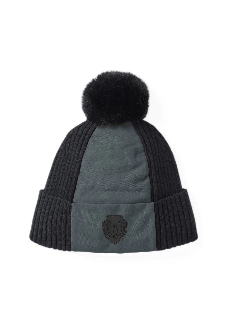 Get cozy when the temperatures drop with this stylish, fleece-lined, wind-blocking pom-pom adorned hat. Featuring a strategically placed quilted front panel and fleece-lined interior to provide added warmth when feeding the horses on those frigid winter mornings. Stretch, rib knit ensures a snug and comfortable fit while the Kerrits logo shows off your equine passion. Accessorizes perfectly with the Stablemate Quilted Jacket.