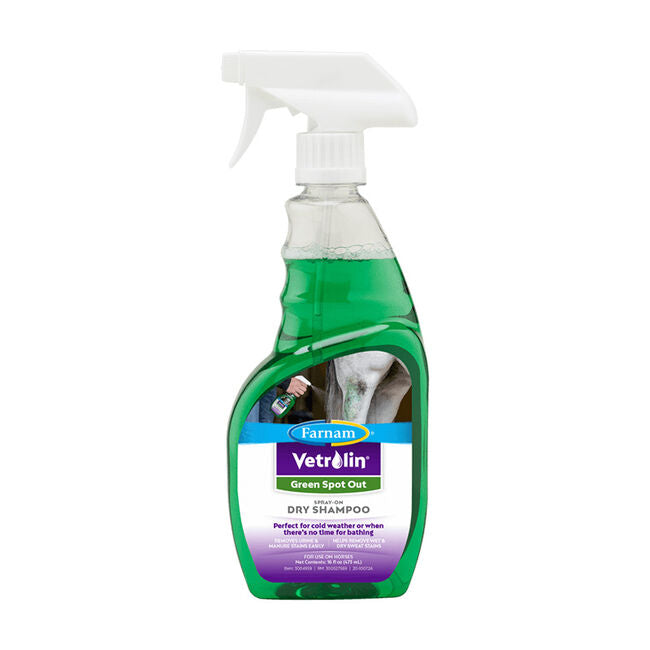 Banish manure and urine stains without bathing your horse using Vetrolin Green Spot Out. This spray-on, dry-clean shampoo is perfect for cold weather or when there's no time for bathing.