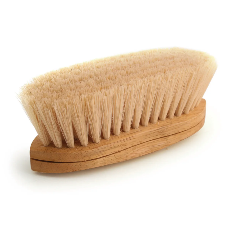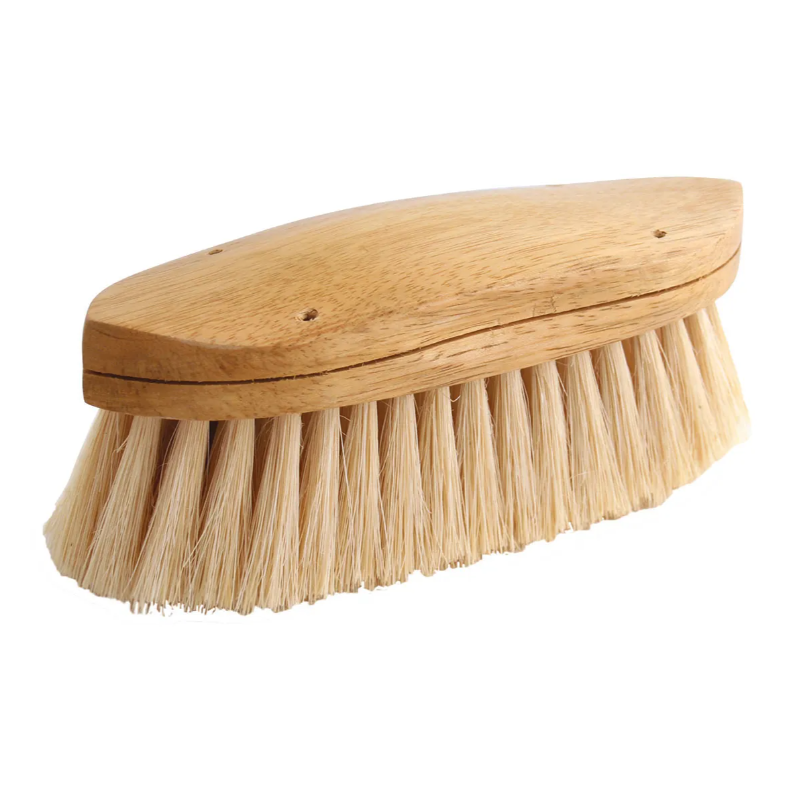 Kiln-dried, double-lacquered, curved-back hardwood brush block with tan, soft tampico fiber bristles.